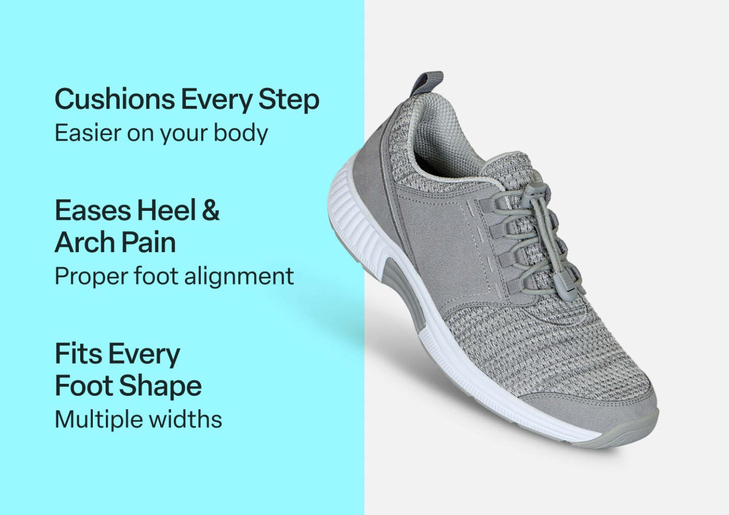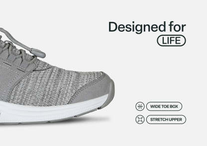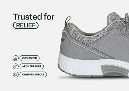 Meet your new partner in keeping active, with a stretchable fabric upper and no-tie bungee lace that make getting into your sneakers as pain-free as wearing them. Our Ortho-Cushion™ System absorbs impacts and smoothly propels your stride, while the padded, breathable upper hugs every curve, bump and bone of your foot, for a relaxed pressure-free fit.
