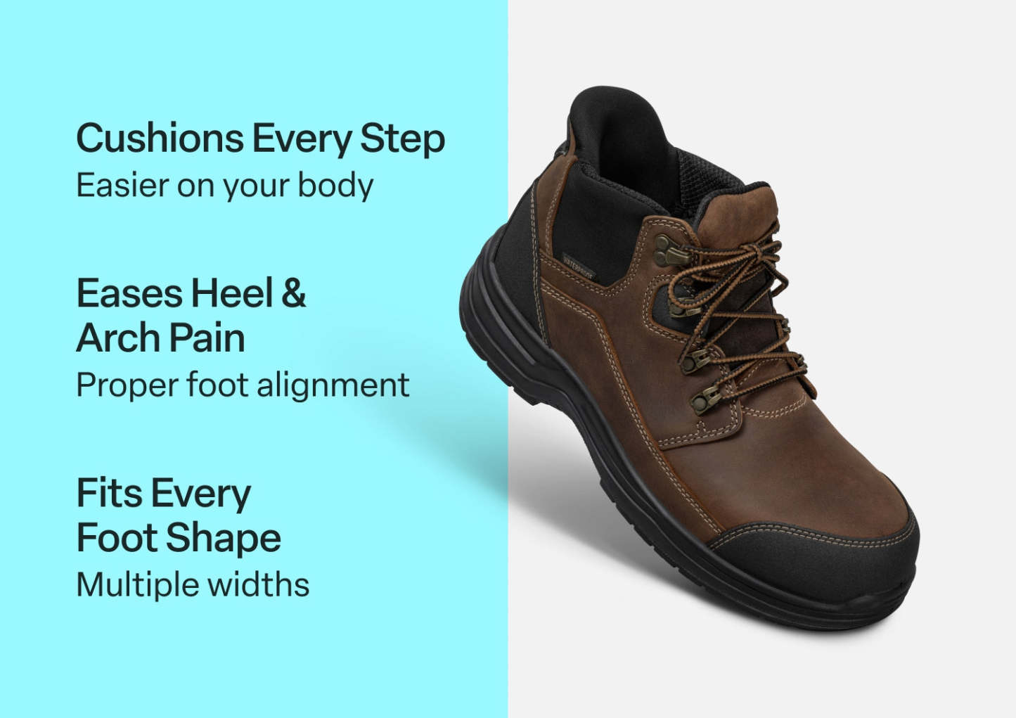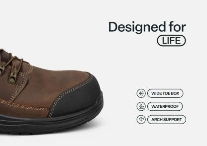 A rugged work boot you can get on & off without tying, thanks to our patented hands-free technology. No matter what the job demands, these safety-rated, crush-resistant, waterproof leather boots protect feet inside and out, hour after hour. No-slip traction, ankle support, a roomy fit and the advanced Ortho-Cushion™ System offload pain and pressure from heel-to-toe.
