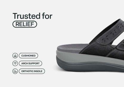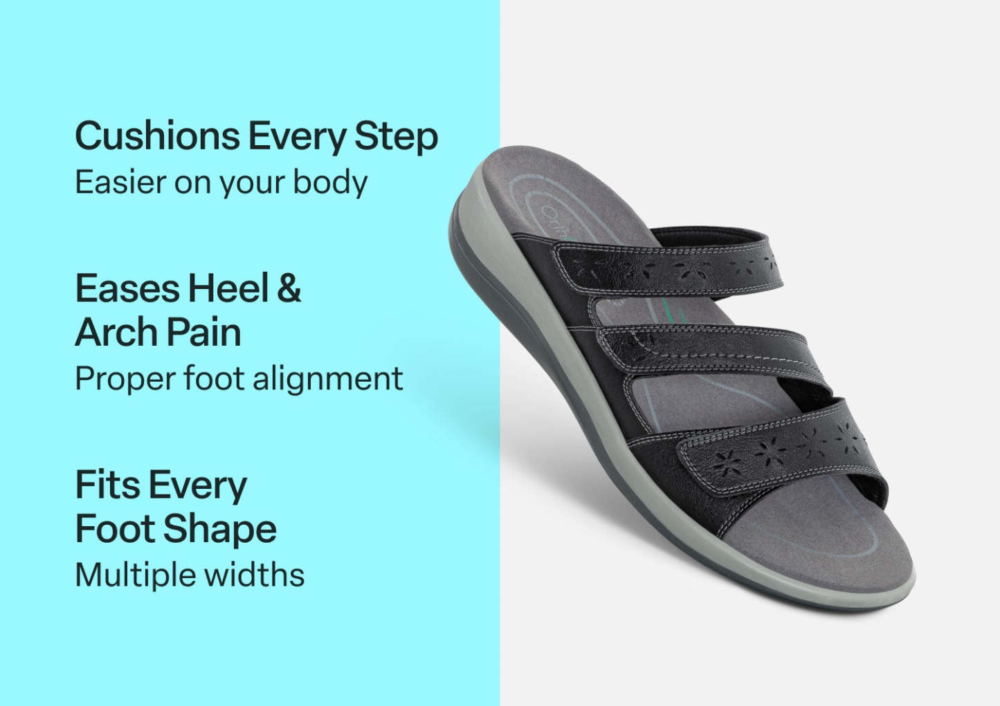 Every comfy strap on our pretty three-strap slide completely opens for true "step-right-in" ease and adjustability that forms to every curve and bump of your foot. Orthofeet's innovative comfort engineering makes going out pain-free, with a foot-hugging fit that keeps you happily in your sandals, not sliding out, for carefree fun under the sun.